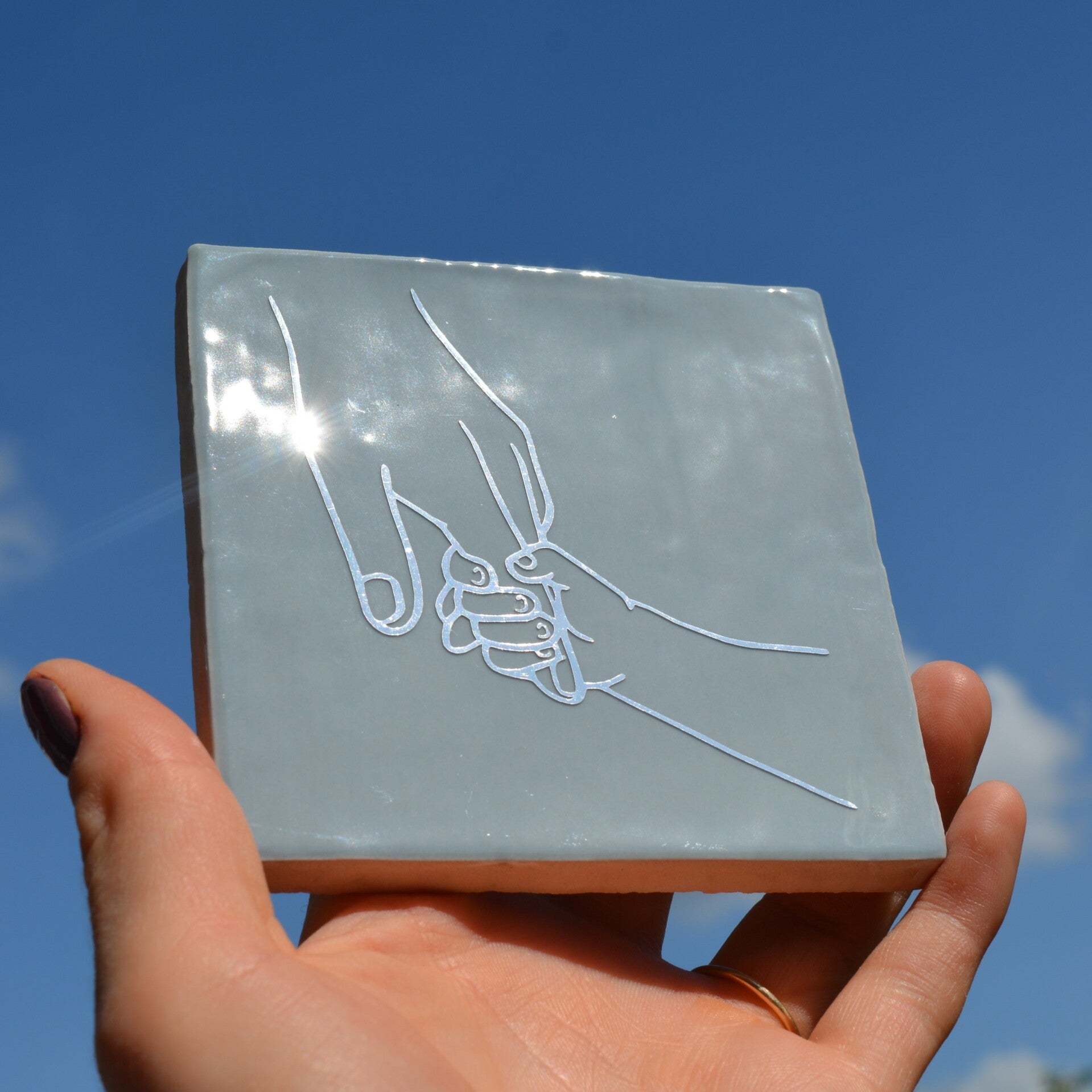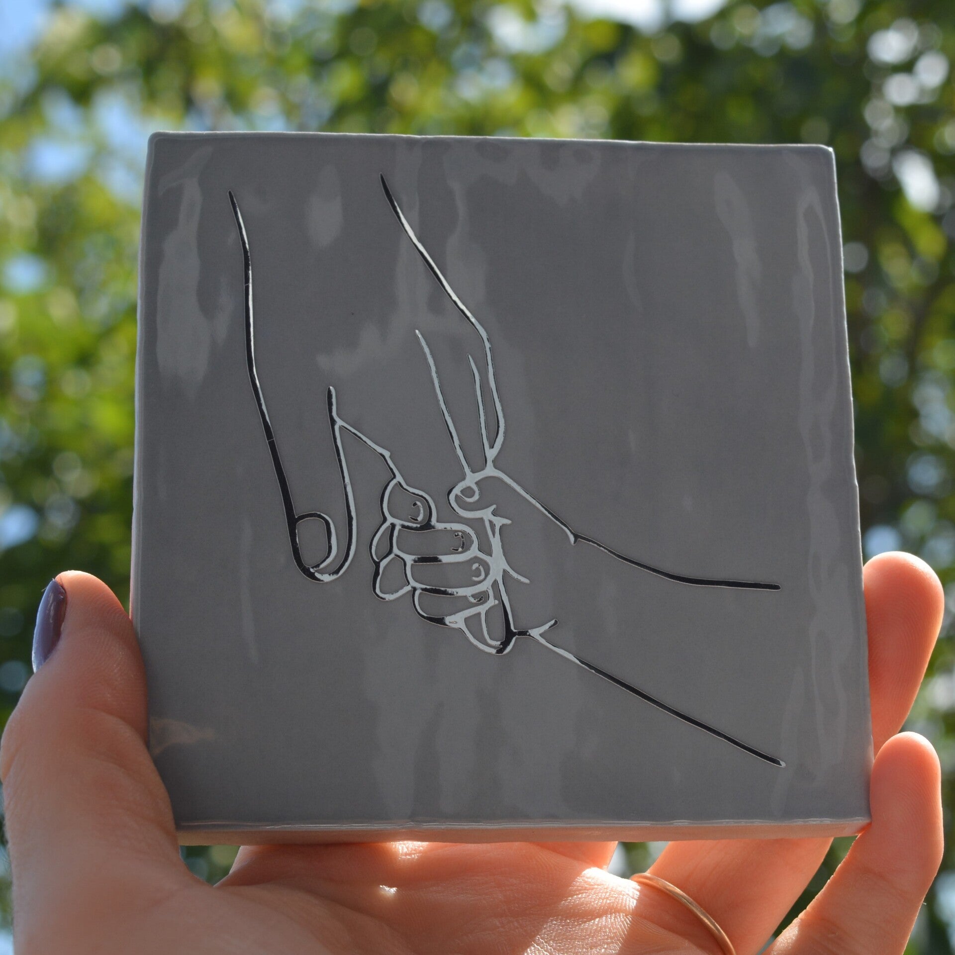 Dit tegeltje is perfect als cadeau bij de geboorte van een baby. Op de afbeelding zijn twee handen te zien: die van een ouder en die van een klein kind. Deze tegeltjes zijn een mooie toevoeging aan de kinderkamer of een eyecatcher tussen alle geboortekaartjes in de huiskamer. Bestel er een ezel-standaard bij zodat het tegeltje extra opvalt. Deze populaire print is in veel verschillende combinaties verkrijgbaar. Welke combinatie is jouw favoriet?