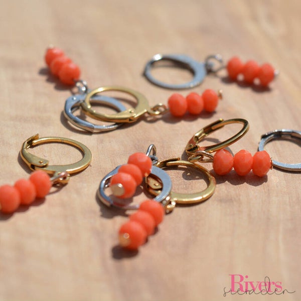 Handgemaakte oorbelletjes met drie oranje glaskraaltjes, te bestellen met een zilveren of gouden hoop.Zilverkleurig